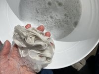 Grab shoe laces from the soapy water and place between your palms.